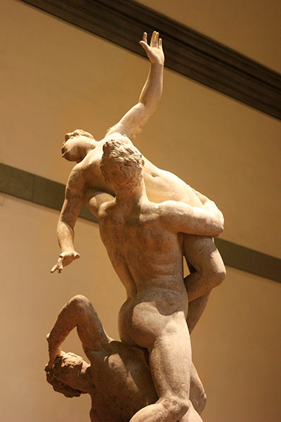 As you enter Accademia Gallery, you will find Rape of the Sabines by Giambologna. It is a plaster cast model in the Hall of Colossus. The marble version is in Piazza della Signoria. The sculpture depicts an older man locked in battle with a young and strong opponent who grabs the young woman in a powerful grip. The three figures create a spiralling vortex which induces the viewer to move around the statue and offers many viewpoints.