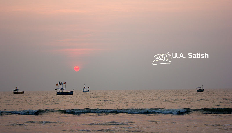 There were a few boats anchored on the sea. The red sun and the waves made a beautiful picture. The beach is in a rather secluded location. Visitors should not stay beyond sunset for security reasons. After sunset, the area becomes dark with few or no lights. Locals may descend on the beach after dark to party, which could be distressing.