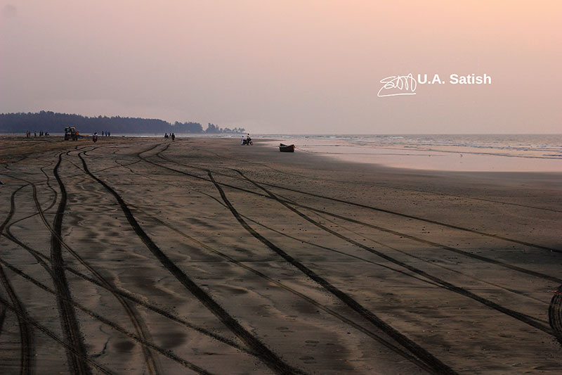 You can drive your car on to the beach. The cars and bikes leave a long trail of tyre tracks on the beach. Some people apparently come to the beach to catch up on their driving lessons. The beach may not seem clean at first. But as you go away from the entrance, it has a clean coast and clear waters.