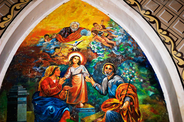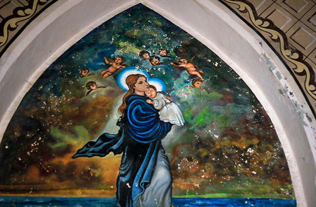 This beautiful sculpture of Virgin Mary is on one side of the main altar. Frescoes cover the ceiling and walls. A. Moscheni of Bergamo and his two assistants completed the frescoes in just over a year.