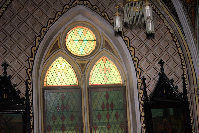 On entering through the massive carved doors, the main marble altar catches the eye. The central niche holds a life-size statue of Jesus Christ. The three stained glass windows above depict the Annuncation, the emblem of the Holy Name of Jesus, and the Nativity. During World War II, church authorities stashed the stained glass windows in a safe place.