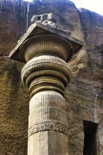 The cave has two storeys. A modest gateway leads to an open courtyard. A monolithic shrine of the Tirthankaras occupies the middle. A tall pillar called manastambha is to the right and a huge elephant to the left. The manastambha has a crown of four seated figures. It is a representation of Jain philosophy and a free-standing pillar.