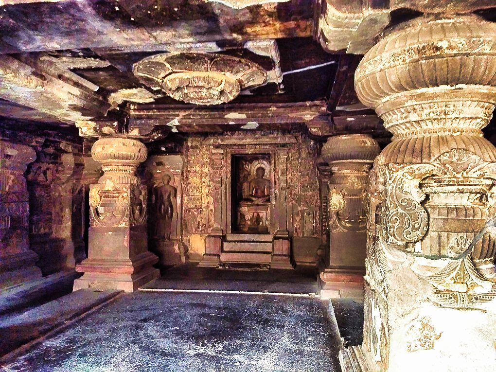 The Jain cave belonging to the Digambara sect is smaller than the Hindu caves. However there are certain similarities in the pillared verandas, symmetric mandapa and pooja worship. The cave has been cut into the basalt mountain without the aid of modern technologies or tools.