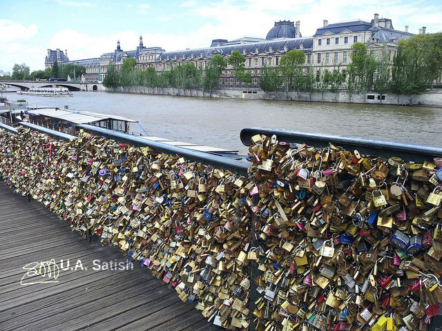 Pont des Arts is one of Paris’ main bridges. It had thousands of locks symbolically fastened to it by love-struck Parisians. The authorities have recently removed the locks as the combined weight of the locks was getting too high.