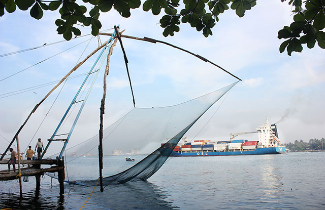 I shot the photo above on a visit to Fort Kochi. An ancient Chinese fishing net is being put to use while a modern container ship passes by at the harbour.