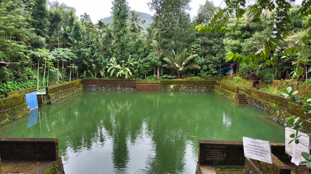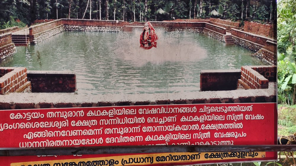 The temple pond is vast and trees grow profusely along its boundaries. The banks are protected by granite and laterite walls. Steps go down to the water on all four sides. As per legend, Kottayam Thampuran was not able to envision the attire and form for a female character in Kathakali. The belief is that the goddess herself appeared before Thampuran at the temple pond and guided him.