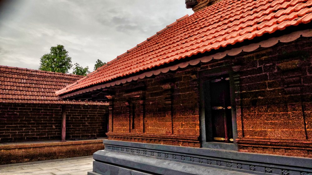 The temple follows the distinctive Kerala style of architecture. The main construction materials are laterite stones, wood and red tiles. The skeletal framework of the temple is wooden while the base and structure are of granite and laterite. The roof slopes at several levels, to protect the framework from the intense monsoon rains. A Saraswati Mandapam has come up by the side of main temple for the performing arts.