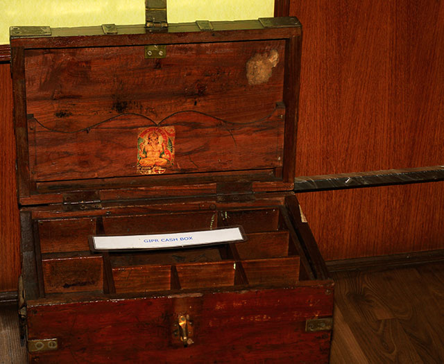 A cash box used in GIP Railway can be seen here. It is a wooden box with metal reinforcements. The box is in good condition even after the passage of many years.