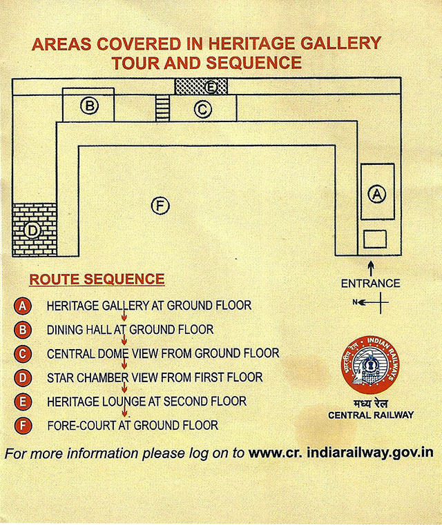 The tour lasts for about 60 minutes. A knowledgeable guide accompanies visitors. The tour begins at the Heritage Gallery on ground floor. The route is as shown above. Photography and the use of flash are permitted. CST is the second most photographed monument in India, next only to Taj Mahal.