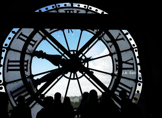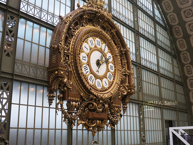 The huge clock is on the fifth floor of the museum. Behind the clock is a restaurant. One can look out through the clock face.