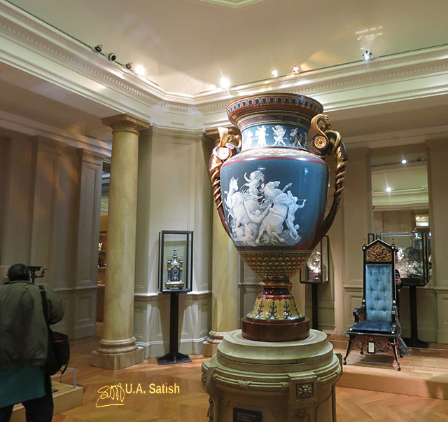 The vase has a height of about 1 metre. It is made of porcelain with application of paste decoration and patinated with golden bronze. It was created by Albert Dammouse and Charles Lameire, Paris.