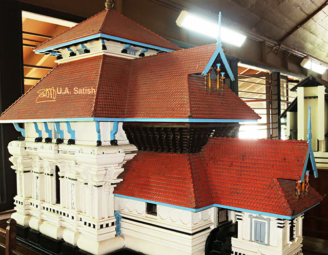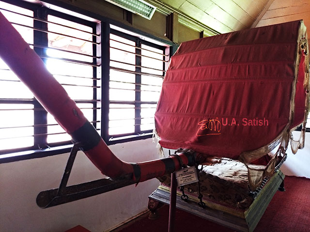 In the verandah surrounding the central room, one can see balustrades, scale models of some temples and a palanquin of the Maharaja of Cochin.