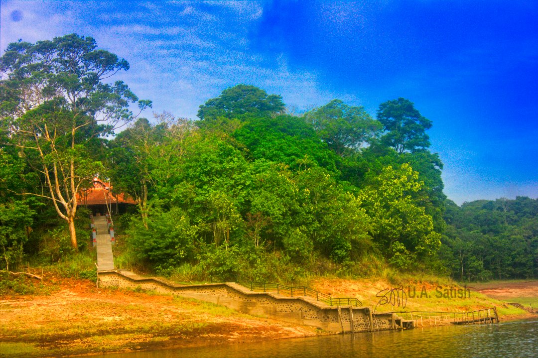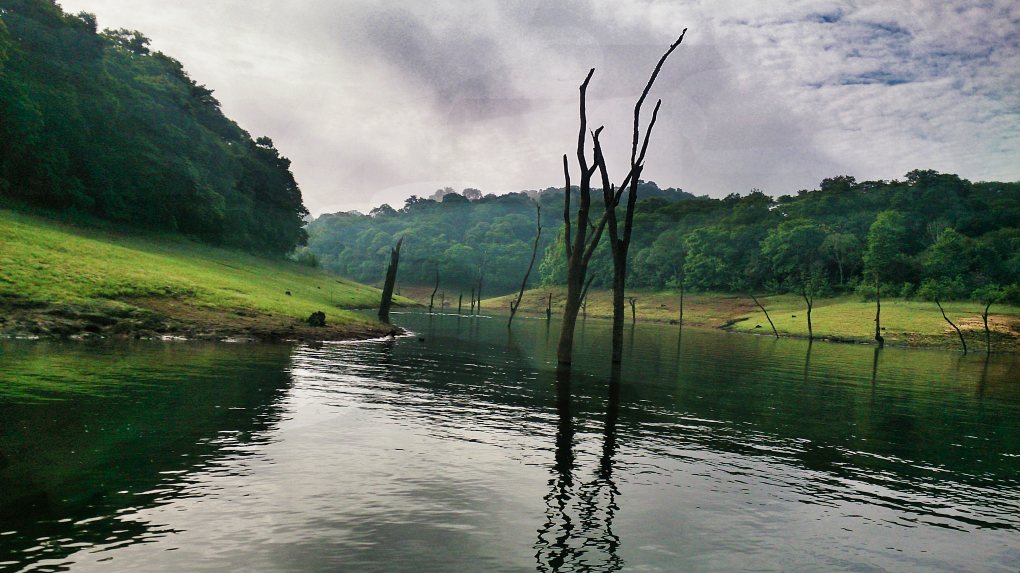 Periyar Lake is a reservoir measuring 26 sq km (10 sq mi). Construction of Mullaperiyar Dam created the reservoir in 1895. Many trees got submerged in the lake. You can still see tree stumps sticking out of the water. Thickly wooded hills of Periyar Tiger Reserve surround the lake. It is 1 km from Kumily in Idukki District of Kerala.