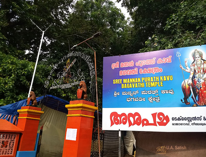 The legend goes that Bhagavathi killed Mannan, a notorious tyrant. To commemorate the event, the devotees of Bhagavathi built Sree Mannanpurath Bhahavathi Temple in Nileshwaram. It goes also by the name of Chadayamangalam Baghavathi Temple