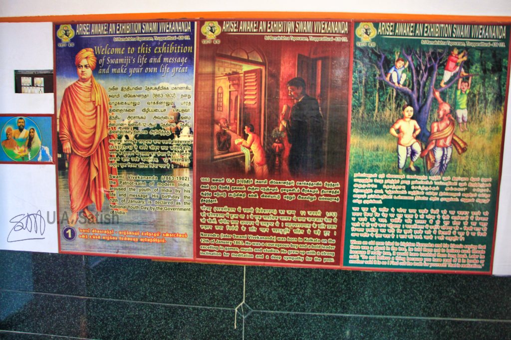 The building is painted in bright orange with touches of white. Decorated domes are on top. Visitors climb up a short flight of steps to the main hall. Here the life history of Swami Vivekananda is depicted on photo posters. Life size golden sculptures of Swami Vivekananda and Raja Bhaskara Sethupathi occupy prime spots. There is a meditation hall on the lower floor.