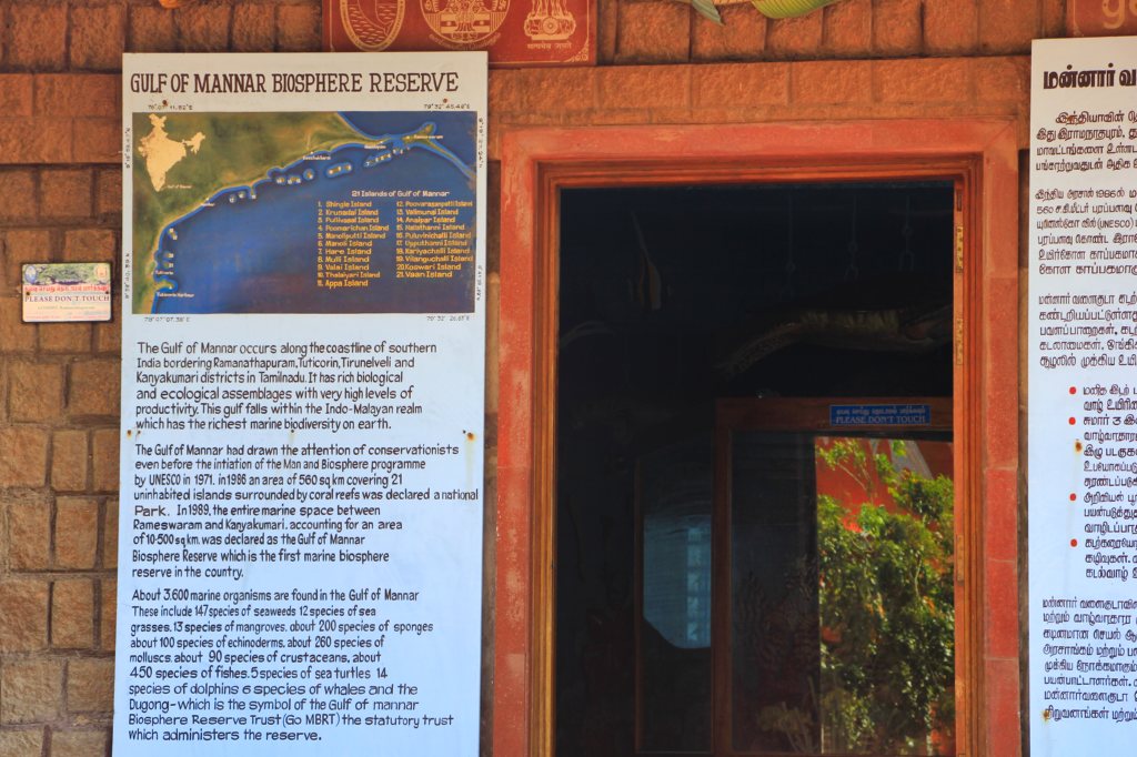 A small museum to one side showcases the Gulf of Mannar Biosphere Reserve. Gulf of Mannar has 21 islands and is home to 5 species of sea turtles, 450 species of fish, 14 species of dolphins, 90 species of crustaceans and 6 species of whales. It also boasts of different types of sea weed, sea grass, mangroves, corals and sponges.